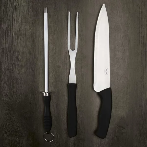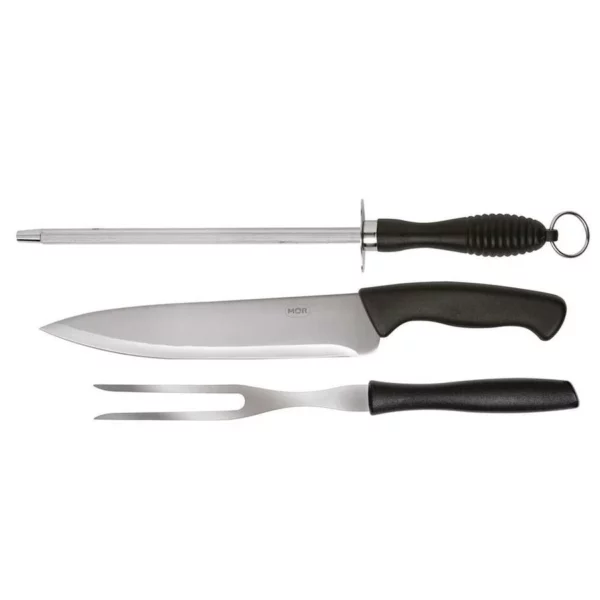 – Conjunto do Assador 3 peças Mor é formado por uma faca, um garfo e uma chaira com lâmina em aço inoxidável, que confere durabilidade e resistência;
